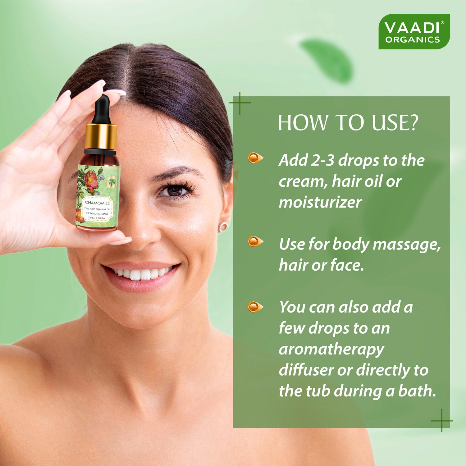 Chamomile essential oil helps revitalize and hydrate the skin. It works as an antiseptic and soothes acne with its natural anti-inflammatory properties. It also relaxes senses with its calming fragrance, and acts as a natural solution for dandruff and dull hair. Each bottle of 10 ml contains 280 drops. With the usage of 4 drops per application, this bottle will last for 70 applications