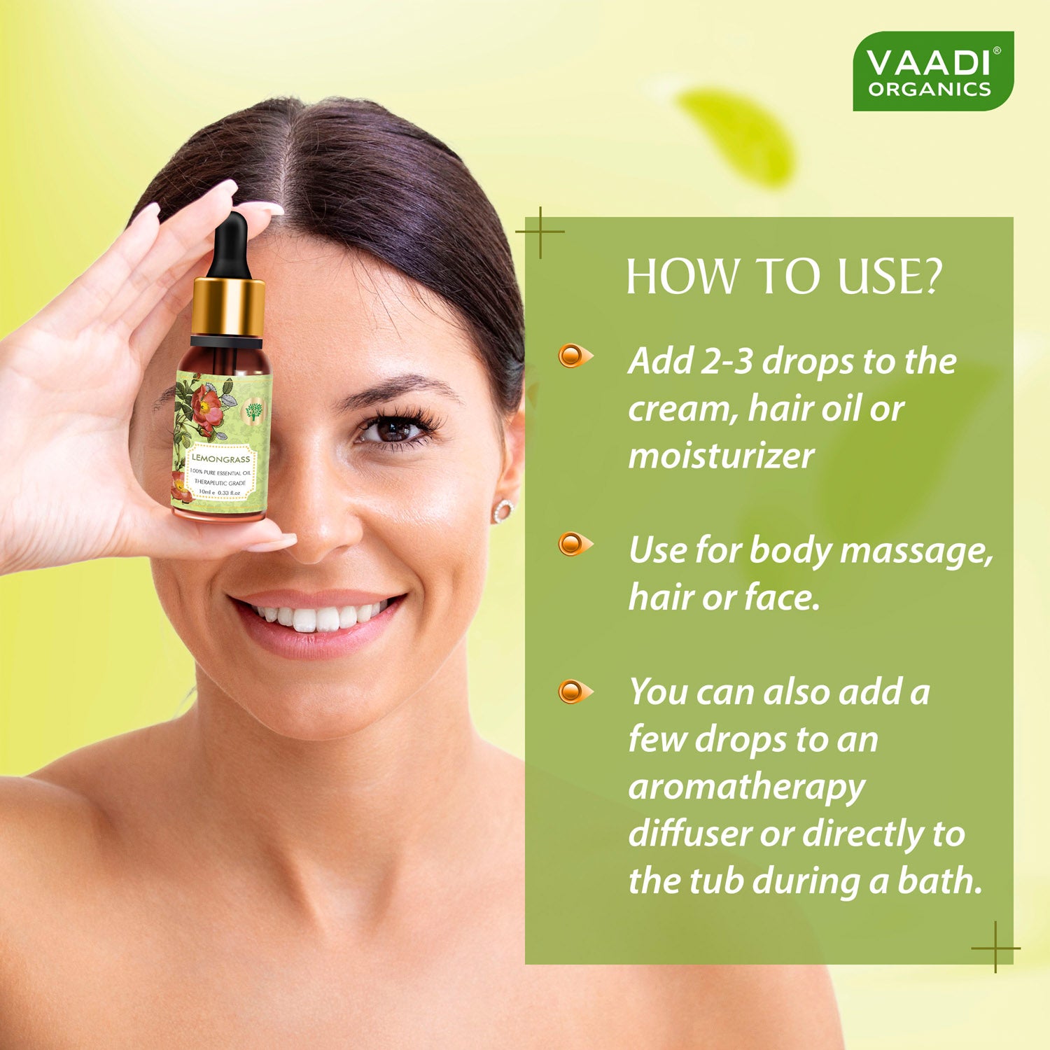 Add 2-3 drops to the cream, hair oil or moisturizer and use for body massage, hair or face. You can also add a few drops to an aromatherapy diffuser or directly to the tub during a bath. Each bottle of 10 ml contains 280 drops. With the usage of 4 drops per application, this bottle will last for 70 applications.