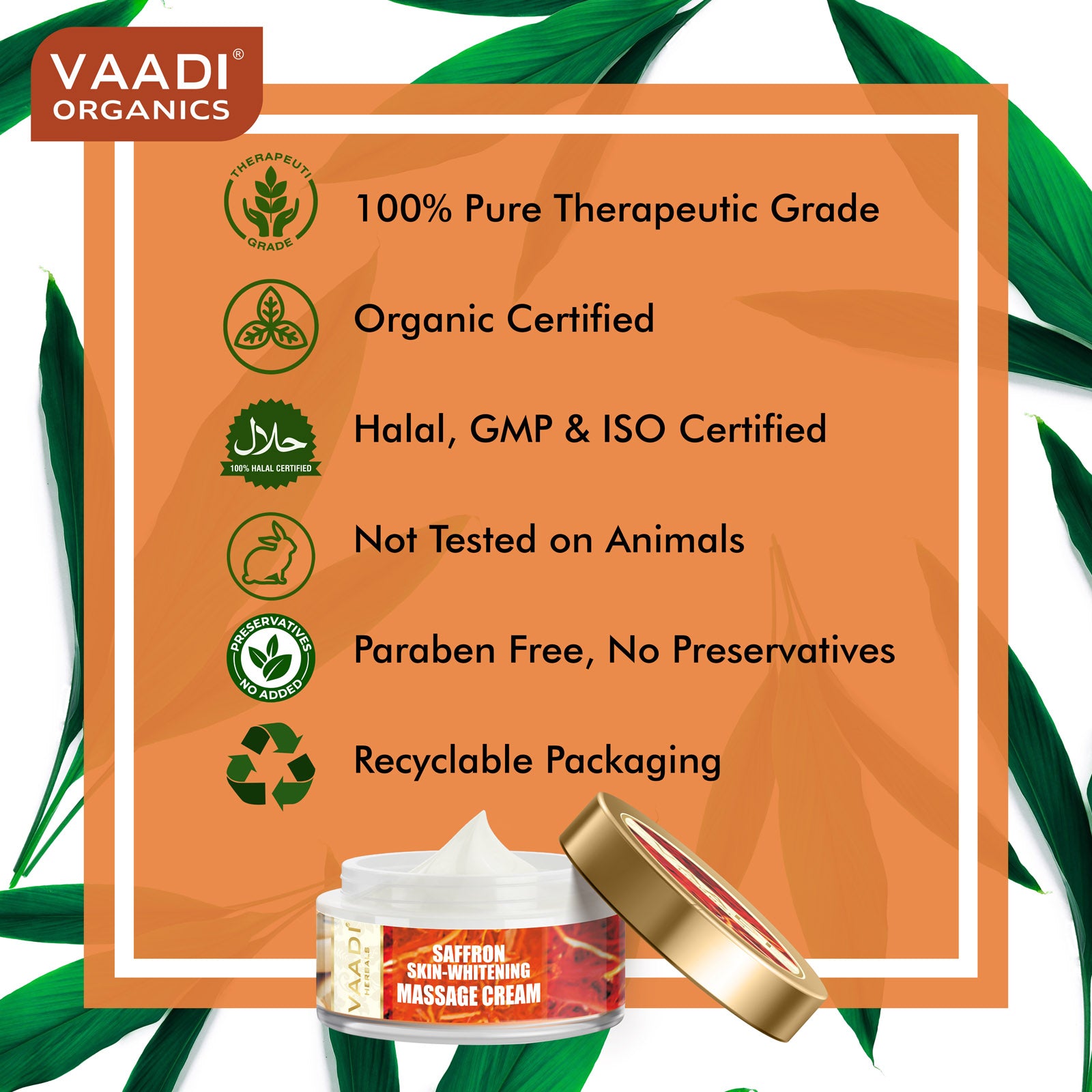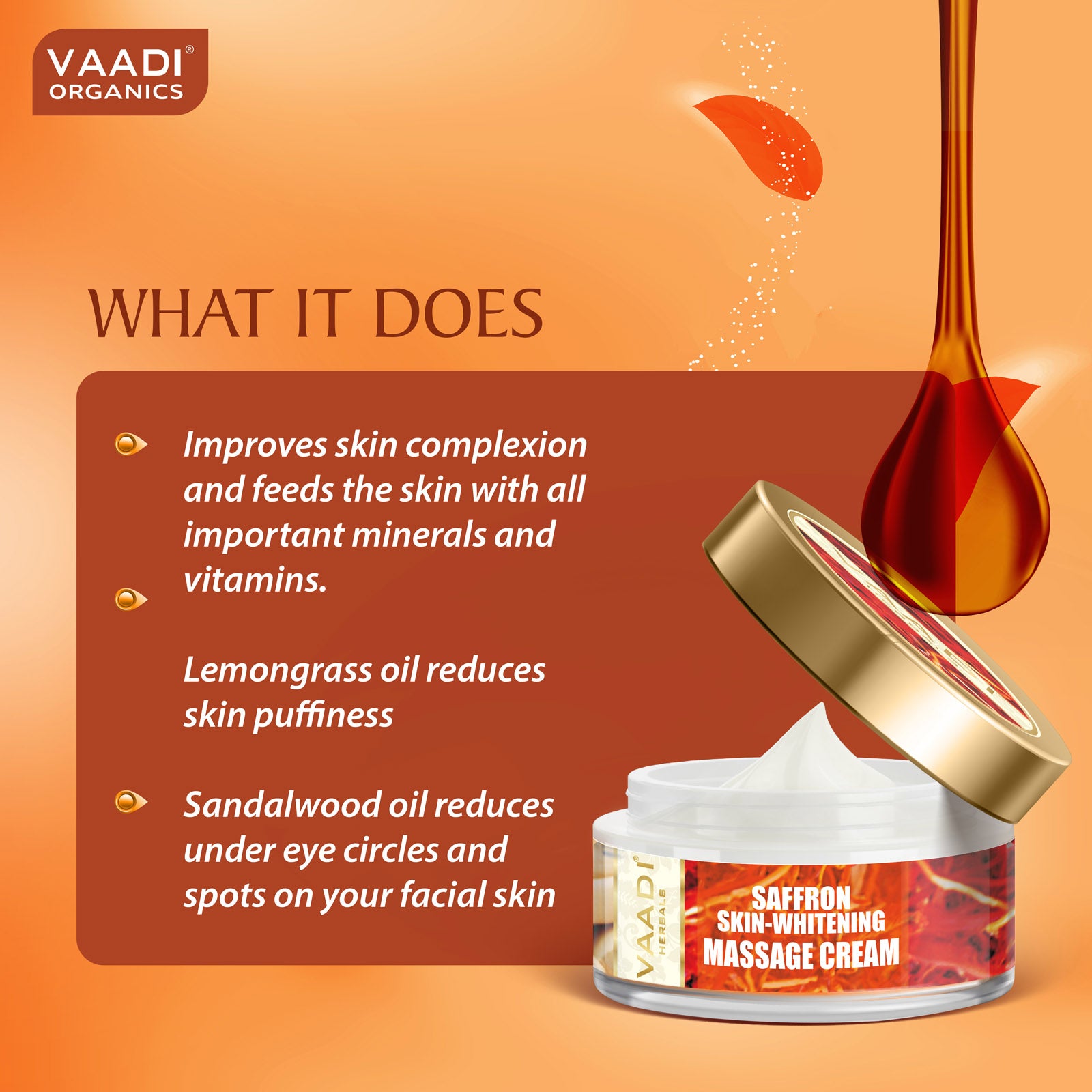 This rich composition of saffron and various oils, improves skin complexion and feeds the skin with all important minerals and vitamins. Lemongrass oil reduces skin puffiness and reduces excessive perspiration. Sandalwood oil reduces under eye circles and removes freckles and spots on your facial skin